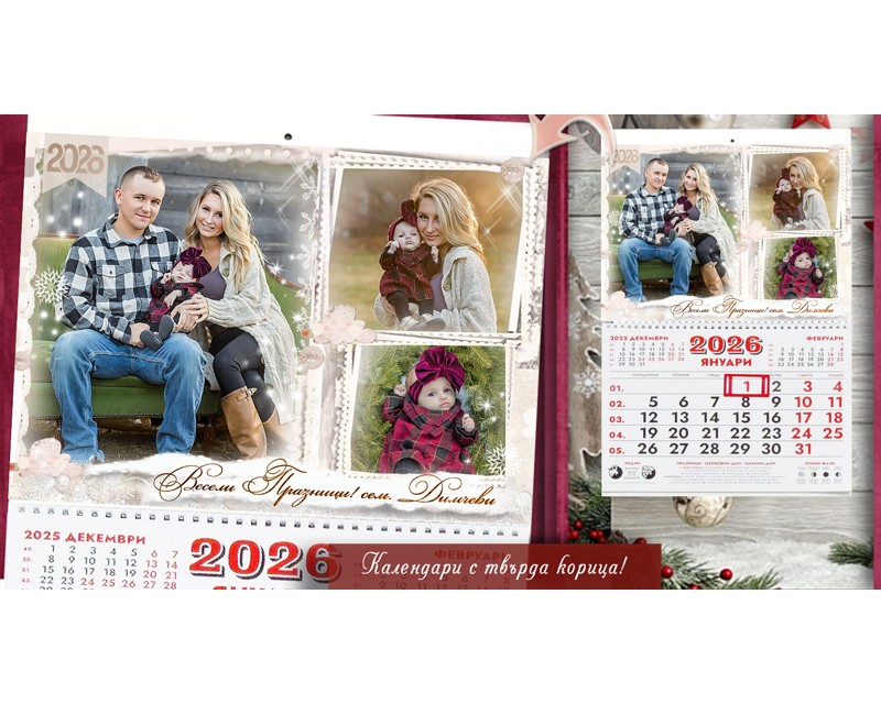 Календарите са с 3 или 4 Ваши любими снимки, изчистена рамка, надпис по избор и с твърда корица + гланцов защитен слой!