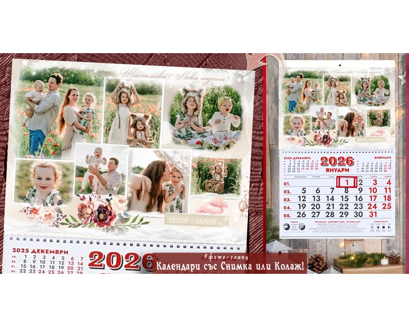 Календар с нежна бяла тема и колаж от 7 снимки от безценните спомени - любим подарък за близките>> изпратете 7 снимки, изпишете предпочитанията си за цветовата гама и надписите.