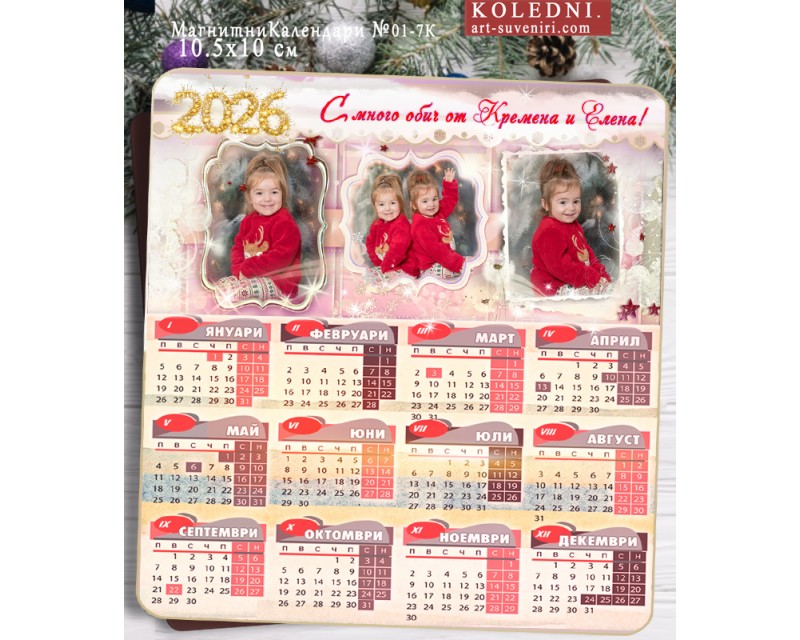Стандартен Размер 13:12 см; По-малкия размер е 10:11 см. Магнитни Календари с колаж от три снимки в нежни цветове по избор - Изберете Вариант от предложените и ни изпратете любими снимки //3 бр// на Вашето Детенце, Група, Отбор, Клас и др., за безплатна разработка на този артикул:: Магнитни Фото Календари №11-7М :: с персонален дизайн и снимката!