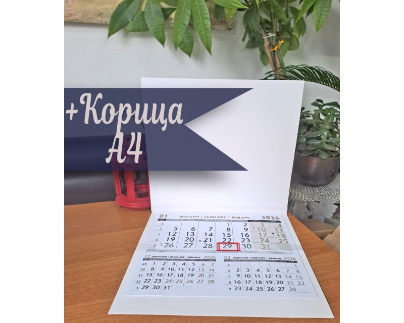 Месеците са с прозорче отбелязващо датата, има информация за празниците и календарно инфо.